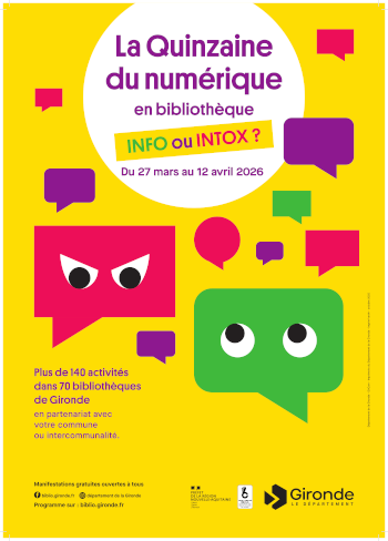 La bibliothèque départementale biblio.gironde est heureuse de vous convier à la Quinzaine du numérique en bibliothèque, un événement ludique et familial qui se tiendra dans plus de 70 bibliothèques girondines du 27 mars au 12 avril 2026, sur le thème Info ou Intox : musclez votre regard sur les médias.
