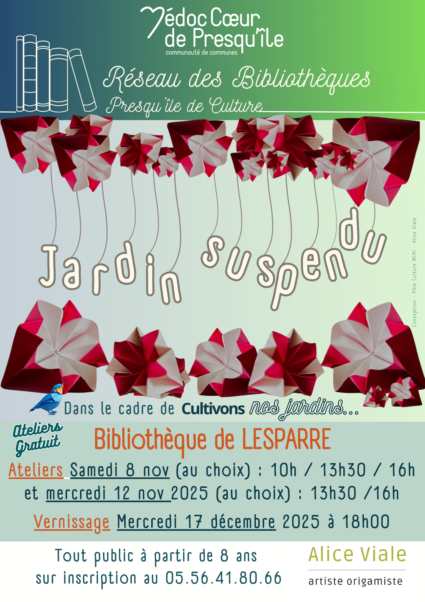 Image Atelier origami : jardin suspendu 08/11/2025 12/11/2025 17/12/2025 Médoc CPI Dans le cadre du programme « Cultivons nos jardins » du Réseau des bibliothèques Médoc Cœur de presqu’île. Atelier Lire la suite